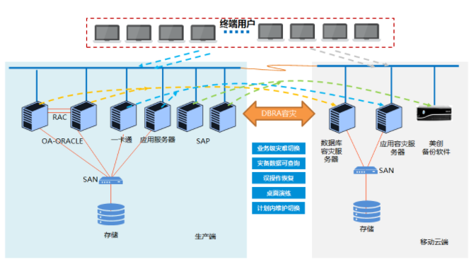 在災備環(huán)境中使用多臺實體機或虛擬化環(huán)境作為容災服務器,容災服務器上需安裝與應用服務器、數(shù)據(jù)庫服務器相同的運行環(huán)境(操作系統(tǒng)、應用系統(tǒng)程序、數(shù)據(jù)庫等)。針對除上述系統(tǒng)以及SAP系統(tǒng)之外的業(yè)務系統(tǒng),在移動云端建設(shè)容災環(huán)境(僅應用服務器),在生產(chǎn)服務器和災備服務器上安裝DBRA全業(yè)務容災系統(tǒng),用來實時同步生產(chǎn)端數(shù)據(jù)至災備環(huán)境。