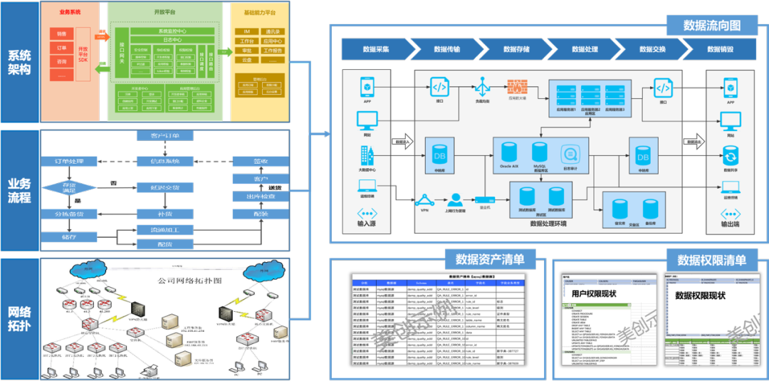 通過專業咨詢團隊+自動化數據發現和分類分級工具,對企業系統架構、業務流程及網絡拓撲進行梳理,明確敏感數據有哪些、都存儲在哪里、流轉情況如何,最終形成數據資產清單、數據流向圖及數據權限清單。