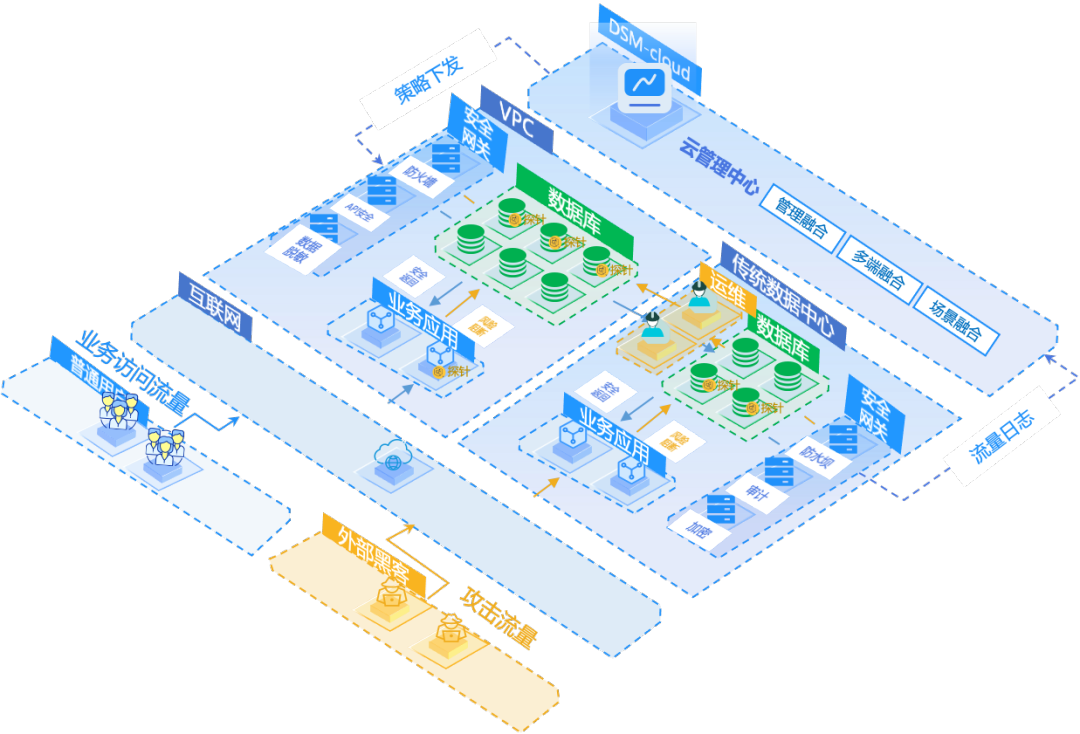 新一代 數據安全管理平臺(DSM Cloud)對海量復雜的資產、身份和事件進行統一的安全監測、安全治理和安全運營,采用云|端技術架構,以云管理中心+多個數據安全能力形成云端一體化布局,協同多種數據安全能力提供全域防護,支持彈性訂閱安全能力,靈活快速適配各種業務場景,實現全域數據安全風險管理、監測、防護、態勢感知、運營。