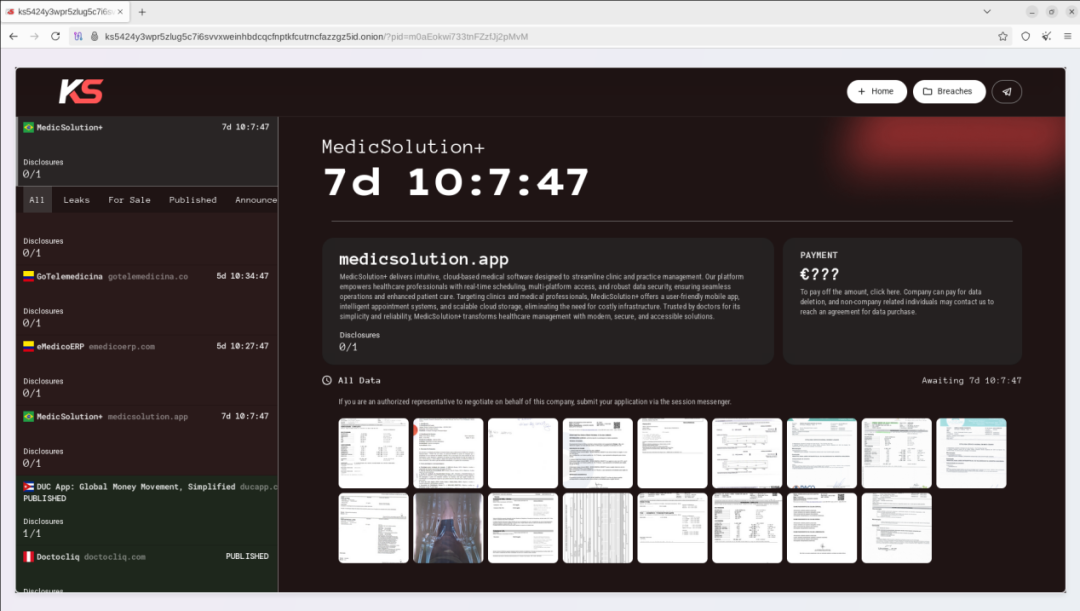 2025年9月8日,KillSec勒索組織聲稱對巴西醫療行業軟件解決方案提供商MedicSolution發動了網絡攻擊。泄露的數據總量超過34GB,包含超過94818個文件,包括:醫療評估、醫學實驗室結果、X光片、未經處理的患者照片(包括顯示身體部位的照片)、與未成年人相關的記錄。研究人員發現,泄露的數據文件屬于巴西當地的醫療機構和醫學實驗室,包括但不限于Vita Exame、Clinica Especo Vida、Centro Diagnostico Toledo、Labclinic、Laboratório Alvaro等。