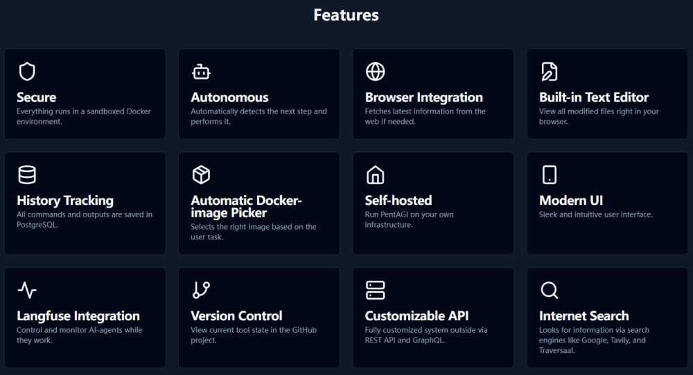 PentAGI 是一款由vxcontrol團(tuán)隊(duì)開發(fā)的創(chuàng)新自動化安全測試工具,具備自動化和智能化的特點(diǎn)。PentAGI具備安全隔離、全自主性、集成多種安全工具、智能記憶、實(shí)時情報(bào)收集、團(tuán)隊(duì)協(xié)作和詳細(xì)報(bào)告生成等。且部署過程簡單,適合安全專業(yè)人士和研究者,能夠在多種場景中高效應(yīng)用,如企業(yè)安全評估、安全研究、教育培訓(xùn)和開發(fā)集成。PentAGI 提供靈活的配置和強(qiáng)大的功能,極大地提升了滲透測試的效率和安全性。PentAGI的核心能力如下圖所示: