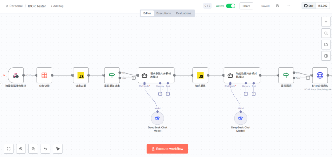 如此以來,就對整個檢測系統進行了解耦,N8N作為檢測中樞,其中的所有模塊都可以復用,如流量解析、請求重放、去重、告警通知等,如果想要測試其他漏洞,只需修改AI節點中的提示詞即可,從維護和擴展上來說,都非常的方便直觀。對于測試人員來說,不需要知道檢測系統怎么啟動運行,只需要啟動一個代理接入即可;對于設計人員來說,只需要在N8N工作流平臺中進行流程設計即可。這樣的模式對于集成到CI/CD會更有優勢。
