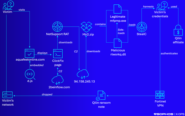 最新研究揭示,一種名為“ClickFix”的社交工程攻擊策略已演變?yōu)榇笠?guī)模勒索軟件入侵的起點。攻擊者利用合法但已被入侵的網(wǎng)站,植入惡意腳本,向訪客展示偽造的“人工驗證”頁面。誘使用戶點擊后,腳本會部署合法的遠(yuǎn)程管理工具NetSupport Manager作為后門,進(jìn)而下載信息竊取程序StealC V2。攻擊者利用竊取的憑證,通過Fortinet VPN設(shè)備侵入受害組織內(nèi)網(wǎng),最終部署了臭名昭著的Qilin勒索軟件。該團(tuán)伙在近兩年內(nèi)已造成超千名受害者,采用數(shù)據(jù)竊取與加密并行的雙重勒索模式。